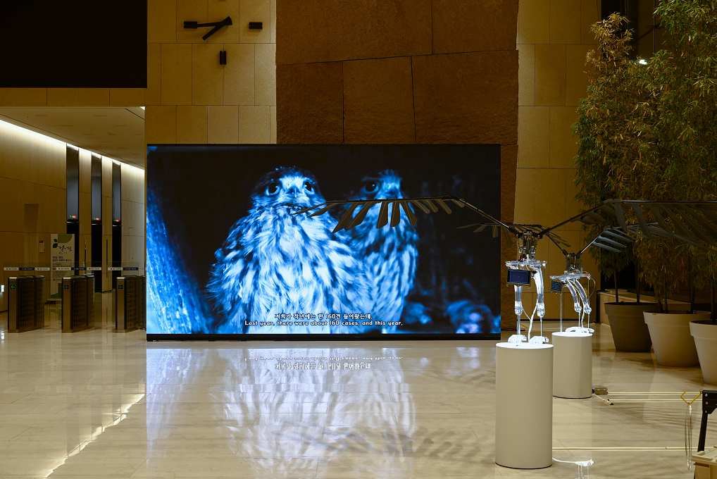 오 작가는 도시 환경에 적응해 인간과 공존하는 천연기념물 황조롱이에서 영감을 받아 작품을 제작했다. '황조롱이 드론' 작품을 통해 인공지능 드론이 도시 텃새들에게 생존 방법을 전달하는 상상력을 선보이며 인간의 편의를 위한 인공지능 기술과 자연의 공존 방법을 모색한다.