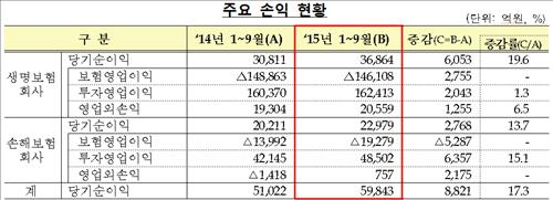 18일 금융감독원이 발표한 '3분기(1∼9월) 보험회사 경영실적 잠정치'를 보면 지난 1∼9월 보험업계 당기순이익은 총 5조9843억원으로 작년 같은 기간(5조1022억원) 대비 8821억원(17.3%) 늘었다.