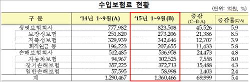 1∼9월 전체 보험사의 수입보험료는 136조466억원으로 작년 같은 기간(129조467억원)과 비교해 6조9999억원(5.4%) 증가했다.