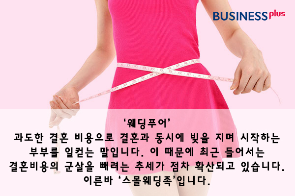 ‘웨딩푸어’ 과도한 결혼 비용으로 결혼과 동시에 빚을 지며 시작하는 부부를 일컫는 말입니다. 이 때문에 최근 들어서는 결혼비용의 군살을 빼려는 추세가 점차 확산되고 있습니다. 이른바 ‘스몰웨딩족’입니다.