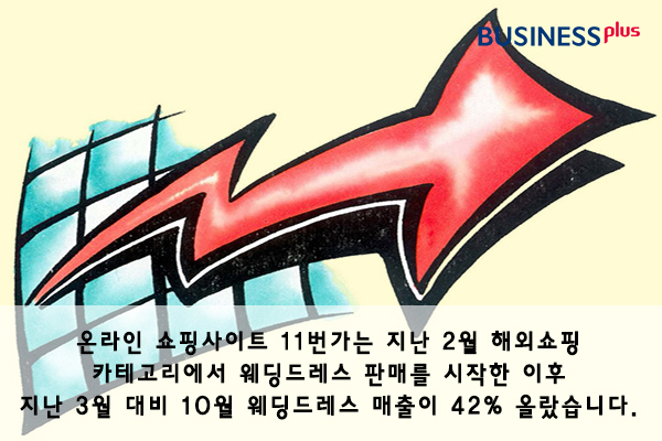 온라인 쇼핑사이트 11번가는 지난 2월 해외쇼핑 카테고리에서 웨딩드레스 판매를 시작한 이후 지난 3월 대비 10월 웨딩드레스 매출이 42% 올랐습니다.