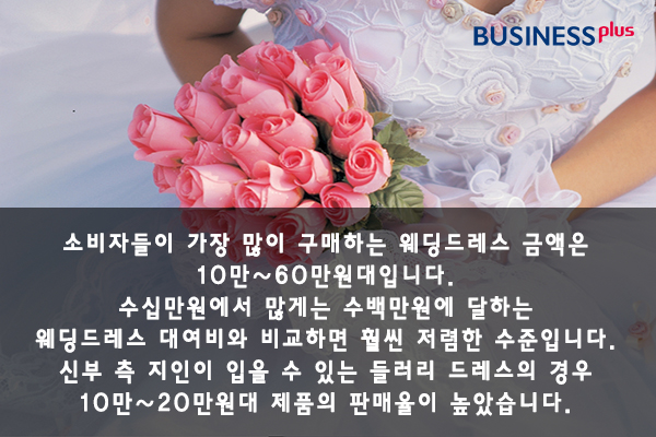 소비자들이 가장 많이 구매하는 웨딩드레스 금액은 10만∼60만원대입니다. 수십만원에서 많게는 수백만원에 달하는 웨딩드레스 대여비와 비교하면 훨씬 저렴한 수준입니다. 신부 측 지인이 입을 수 있는 들러리 드레스의 경우 10만∼20만원대 제품의 판매율이 높았습니다.
