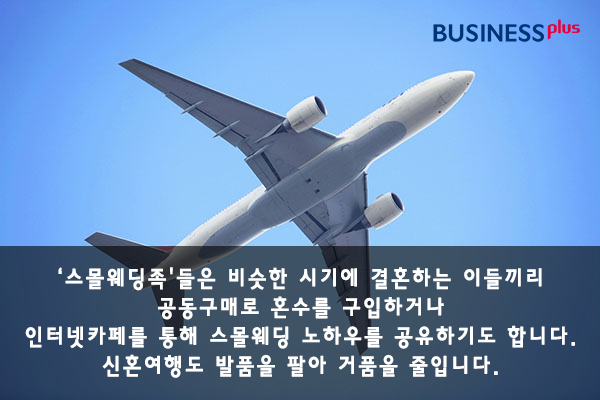 '스몰웨딩족'들은 비슷한 시기에 결혼하는 이들끼리 공동구매로 혼수를 구입하거나 인터넷카페를 통해 스몰웨딩 노하우를 공유하기도 합니다. 신혼여행도 고가의 패키지 선택 대신 발품을 팔아 거품을 줄입니다.