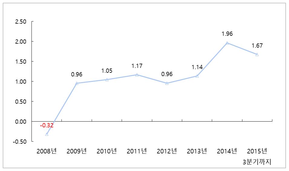 2015년 들어 3분기까지 전국의 토지가격은 1.67% 올랐다. 2009년 이후 7년 연속 상승세를 이어갔다. 월간 기준으로는 2010년 11월 이후 59개월 연속 상승세다.