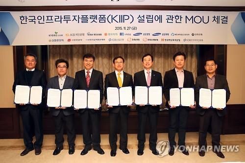 산업은행은 27일 우정사업본부, 한국교직원공제회, 삼성생명 등 18개 금융기관과 '한국인프라투자플랫폼(KIIP)' 설립 약정(MOU)을 체결했다. KIIP는 신규 인프라사업에 대한 민간투자를 활성화하기 위해 만든 예비투자자 협의체다. 애초 정부의 2015년 하반기 경제정책방향에서 10조원 규모로 계획됐다. 그러나 인프라 부문에 대한 민간투자가 확대될 것이라는 기대감이 반영돼 약정의향액이 14조5000억원 규모로 확대됐다.