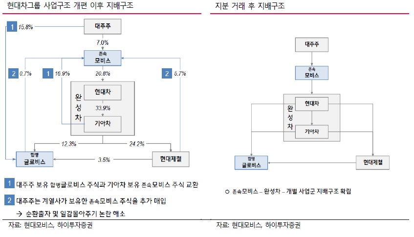 강 연구원은 "새로운 지배구조 개편안은 주주들을 충분히 만족시키면서, 주주총회의 수를 최소화하는 방향으로 변경될 가능성이 높다"며 "지주사체제로의 이행을 회피하고 현대글로비스를 활용하는 방침은 유지될 것"이라고 예측했다.