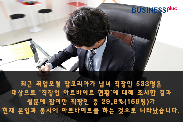 최근 취업포털 잡코리아가 남녀 직장인 533명을 대상으로 ‘직장인 아르바이트 현황’에 대해 조사한 결과 설문에 참여한 직장인 중 29.8%(159명)가 현재 본업과 동시에 아르바이트를 하는 것으로 나타났습니다.
