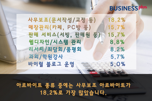 아르바이트 종류 중에는 사무보조 아르바이트가 18.2%로 가장 많았습니다.