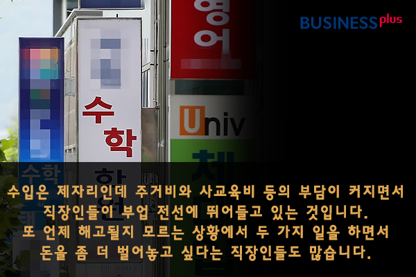 수입은 제자리인데 주거비와 사교육비 등의 부담이 커지면서 직장인들이 부업 전선에 뛰어들고 있는 것입니다. 또 언제 해고될지 모르는 상황에서 두 가지 일을 하면서 돈을 좀 더 벌어놓고 싶다는 직장인들도 많습니다.