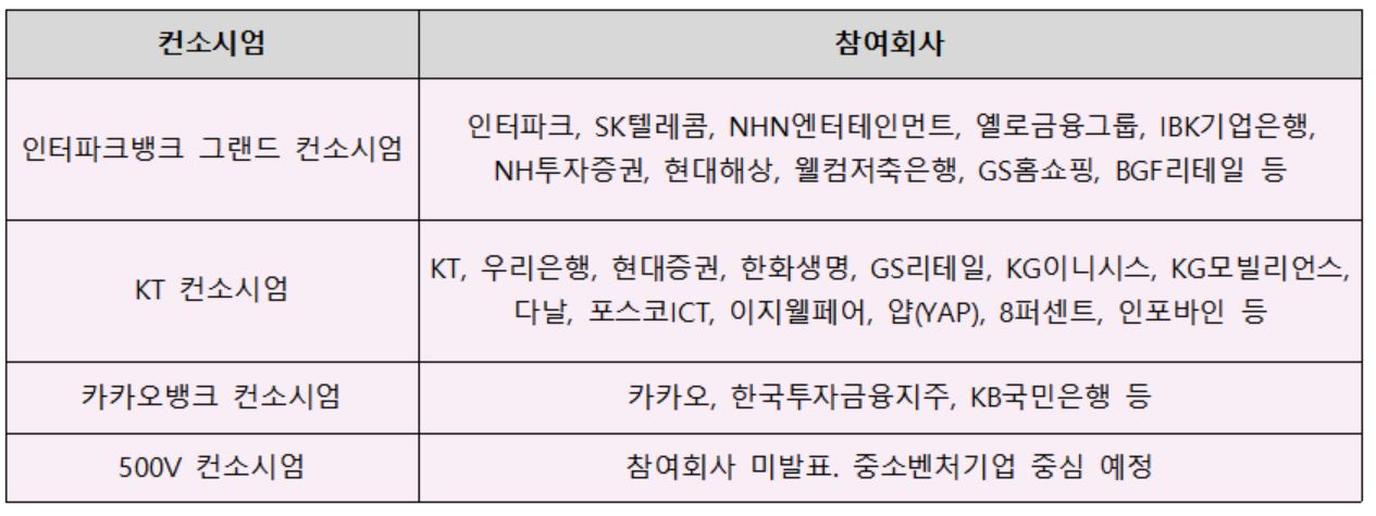 그간 준비 단계에서 참여를 선언한 컨소시엄은 인터파크뱅크 그랜드·KT·카카오뱅크·500V 컨소시엄 등 4곳이다. 세부 구성을 발표하지 않은 500V 컨소시엄 외에 나머지 3곳만 해도 참여기업이 30개에 달한다.