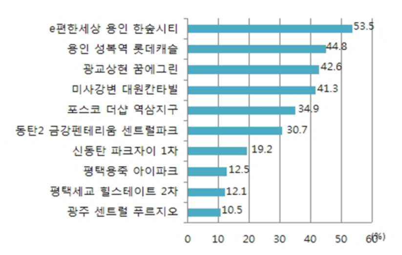 e편한세상 용인 한숲시티에 이어 2위는 용인 성복역 롯데캐슬, 3위는 광교상현 꿈에그린이 차지했다. 모두 용인 지역이다.