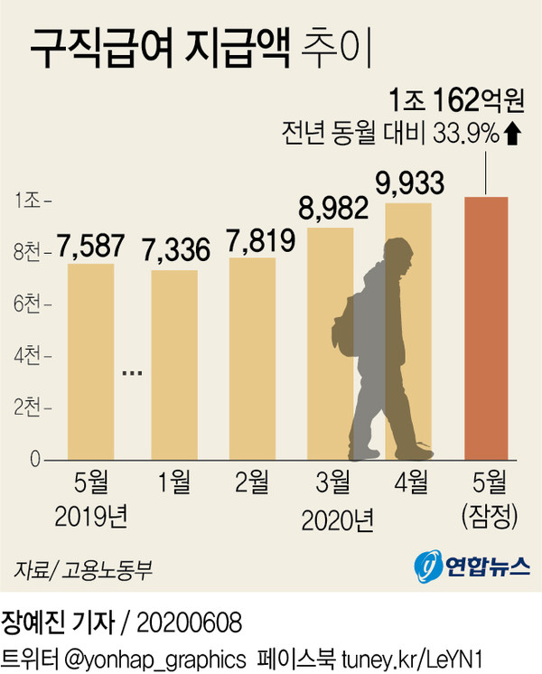 고용노동부가 8일 발표한 '고용행정 통계로 본 5월 노동시장 동향'에 따르면 지난달 구직급여 지급액은 1조162억원으로, 작년 동월(7587억원)보다 33.9% 급증했다.