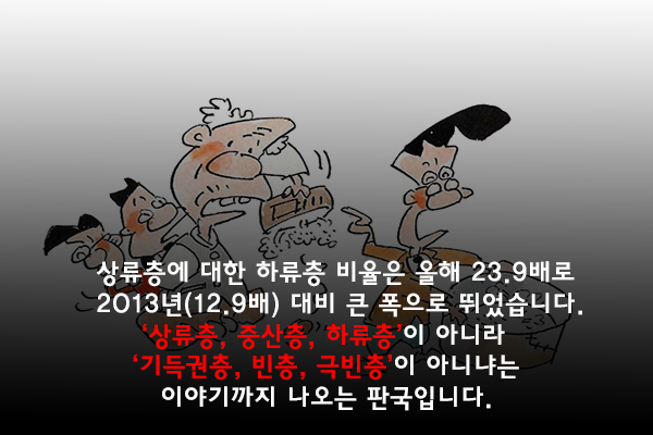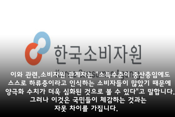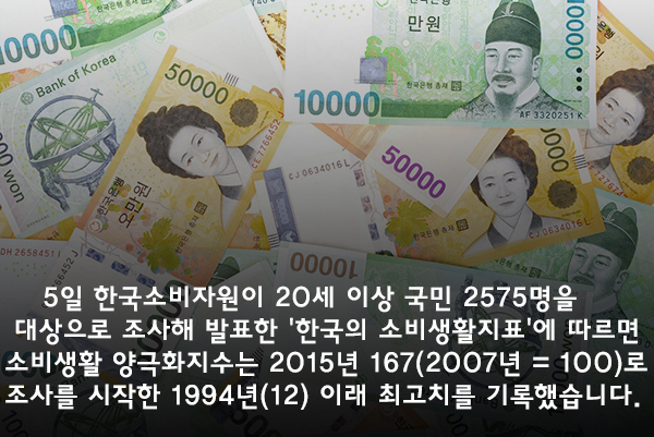 소비생활 양극화지수는 2015년 167(2007년 = 100)로 조사를 시작한 1994년(12) 이래 최고치를 기록했습니다.