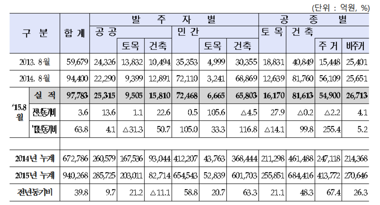 민간부문에서는 토목공종이 철도궤도, 토지조성, 기계설치 부문에서 증가해 6665억원을 기록했다. 이는 지난해 같은 달과 비교해 3424억원 증가한 수치다. 건축공종에서는 신규주택을 중심으로 그동안 급격한 증가세를 보이던 건축이 시장의 공급과잉 우려 등에 따라 12.6% 감소하면서 4조3878억원을 기록했다.