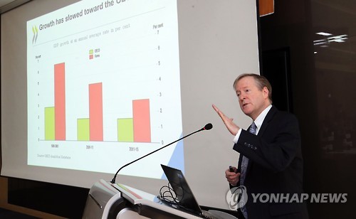 랜덜 존스 OECD 경제국 한국·일본 담당관은 이날 한국개발연구원(KDI) 세종청사에서 열린 세미나에서 보고서를 발표하면서 "수출이 한국 경제에 굉장히 중요한데, 2010년부터 지속된 세계교역 부진과 중국 성장률 둔화가 악영향을 주고 있다"고 말했다.
