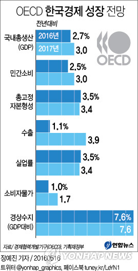 OECD는 16일 내놓은 '2016년 한국경제보고서'에서 올해 한국 국내총생산(GDP) 성장률이 2.7%에 그칠 것으로 예상했다.