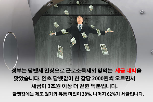 정부는 담뱃세 인상으로 근로소득세와 맞먹는 '세금 대박'을 맞았습니다. 연초 담뱃값이 한 갑당 2000원씩 오르면서 세금이 3조원 이상 더 걷힌 덕분입니다. 담뱃값에는 제조 원가와 유통 마진이 38%, 나머지 62%가 세금입니다.