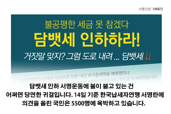 담뱃세 인하 서명운동에 불이 붙고 있는 건 어쩌면 당연한 귀결입니다. 14일 현재 기준 한국납세자연맹 서명란에 의견을 올린 국민은 5500명에 육박하고 있습니다.