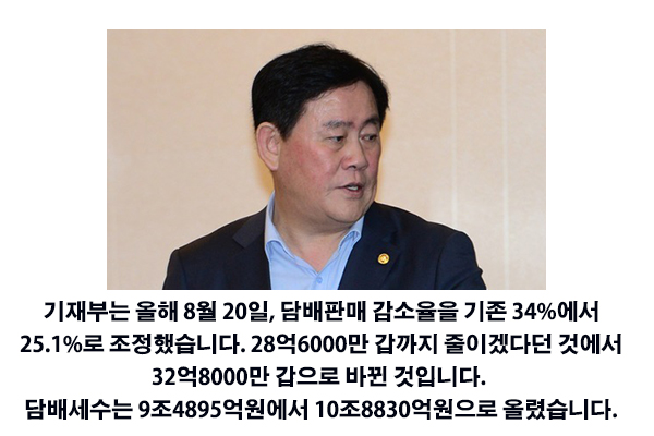 기재부는 올해 8월 20일, 담배판매 감소율을 기존 34%에서 25.1%로 조정했습니다. 28억6000만 갑까지 줄이겠다던 것에서 32억8000만 갑으로 바뀐 것입니다. 담배세수는 9조4895억원에서 10조8830억원으로 올렸습니다.