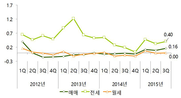 한편 전세가격은 0.40% 상승했다. 오피스텔 전세 품귀 현상이 지속되고 있는 데다 아파트 전세난까지 겹치면서 상승폭은 전분기 대비 0.08%p 커졌다.