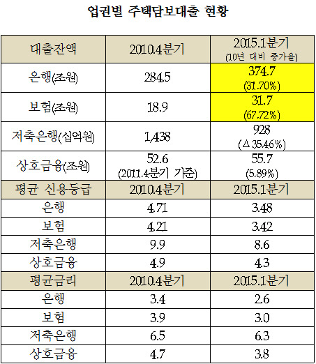 한편 대출을 받는 절차는 5년 새 상대적으로 까다로워진 것으로 알려졌다. 은행권과 보험권은 2010년 4분기 당시 평균 4등급 정도 되면 주택담보대출을 받을 수 있었으나, 2015년 1분기 와서는 담보가 있음에도 3등급 가량 돼야 대출을 받을 수 있게 됐다. 구체적으로 은행은 평균 신용등급이 4.7등급에서 3.4등급으로, 보험은 4.2등급에서 3.4등급으로, 저축은행은 9.9등급에서 8.6등급으로, 상호금융은 4.9등급에서 4.3등급으로 상승했다.