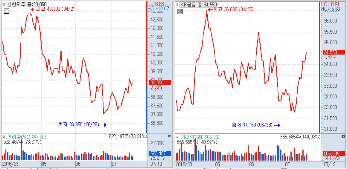 19일 유가증권시장에서 신한지주는 전일보다 0.39% 상승한 3만8850원, KB금융은 1.32% 상승한 3만4500원에 장을 마감했다. 이들 주가는 지난달 브렉시트 소식이 전해진 이후 낙폭을 키웠다가 현재까지 브렉시트 이전 수준을 회복한 상태다.