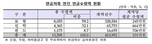 금융감독원이 17일 발표한 '연금저축 현황 분석 결과'에 따르면 연금저축 가입자가 지난해 수령한 연금 총액은 1조3595억원(약 41만건)이었다. 계약당 평균 연금 수령액은 331만원이었다. 월평균 28만원 꼴로 연금을 받은 셈이다.