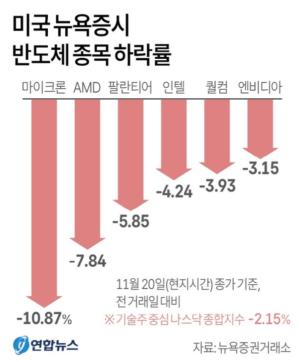 미국 뉴욕 주식시장이 20일(현지시간) 인공지능(AI) 관련주 거품 우려가 지속함에 따라 장중 급락 반전하며 약세로 마감했다.
