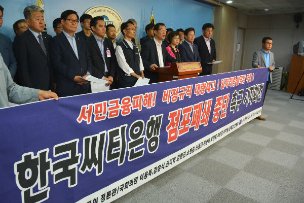 15일 씨티은행 경영진과 금융노조 한국씨티은행지부는 각각 다른 장소에서 기자회견을 했다. 사측은 지점 통폐합의 정당성을 설명했고 노조는 지점 폐쇄를 중단하라고 비난했다.