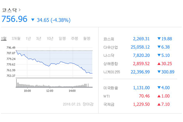 23일 코스닥지수는 전 거래일보다 34.65포인트(4.38%) 하락한 756.96에 장을 마쳤다. 올해 들어 종가 기준 최저치다.