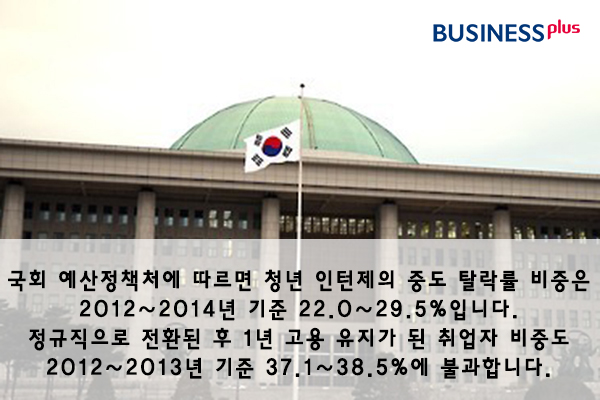 국회 예산정책처에 따르면 청년 인턴제의 중도 탈락률 비중은 2012∼2014년 기준 22.0∼29.5%입니다. 정규직으로 전환된 후 1년 고용 유지가 된 취업자 비중도 2012∼2013년 기준 37.1∼38.5%에 불과합니다.