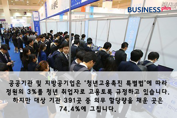 공공기관 및 지방공기업은 ‘청년고용촉진 특별법’에 따라 정원의 3%를 청년 취업자로 고용토록 규정하고 있습니다. 하지만 대상 기관 391곳 중 의무 할당량을 채운 곳은 74.4%에 그칩니다.