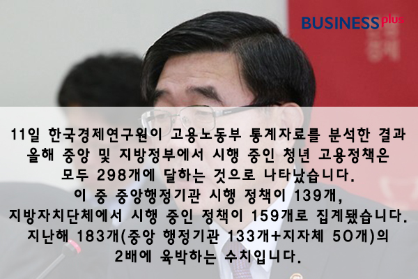 11일 한국경제연구원이 고용노동부 통계자료를 분석한 결과 올해 중앙 및 지방정부에서 시행 중인 청년 고용정책은 모두 298개에 달하는 것으로 나타났습니다. 이 중 중앙행정기관 시행 정책이 139개, 지방자치단체에서 시행 중인 정책이 159개로 집계됐습니다. 지난해 183개(중앙 행정기관 133개+지자체 50개)의 2배에 육박하는 수치입니다.