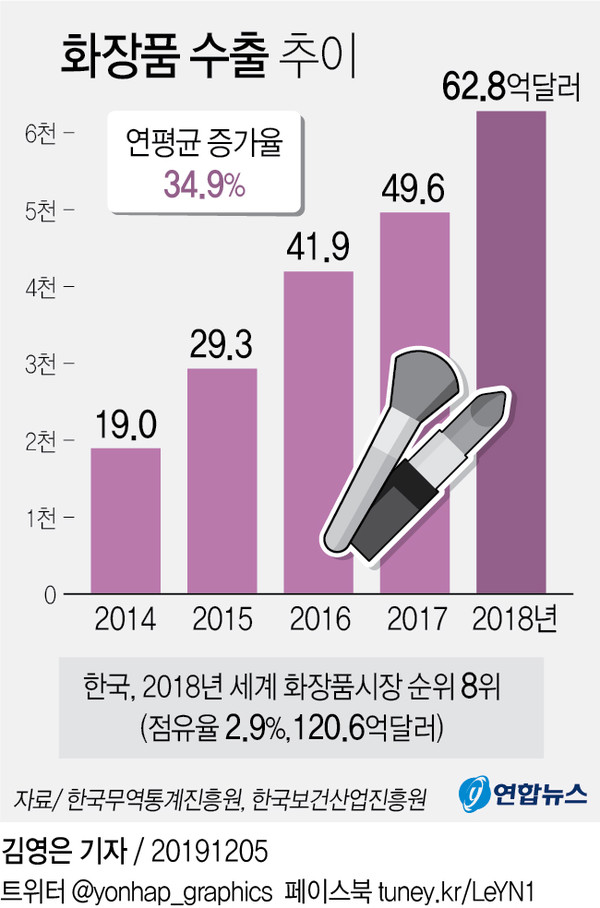 한국의 화장품과 화장법 등을 의미하는 'K-뷰티'는 혁신적인 제품으로 세계시장을 공략해왔다. 한국의 화장품 수출액은 2014년 18억 달러에서 2018년 63억달러로 연평균 34.9% 성장했으며, 작년 기준으로 세계 4위 규모다.