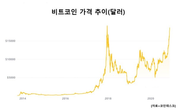 비트코인은 2017년 최고의 랠리를 뽐냈다. 암호화폐 정보업체 코인데스크에 따르면 비트코인 가격은 그해 연말 역대 최고인 1만9665.39달러까지 올랐다. 1년간 1400% 가까이 뛴 것이다. 비트코인은 이듬해 70% 급락하며 인기가 시들해졌지만, 최근 다시 가파른 상승세로 주목받고 있다.