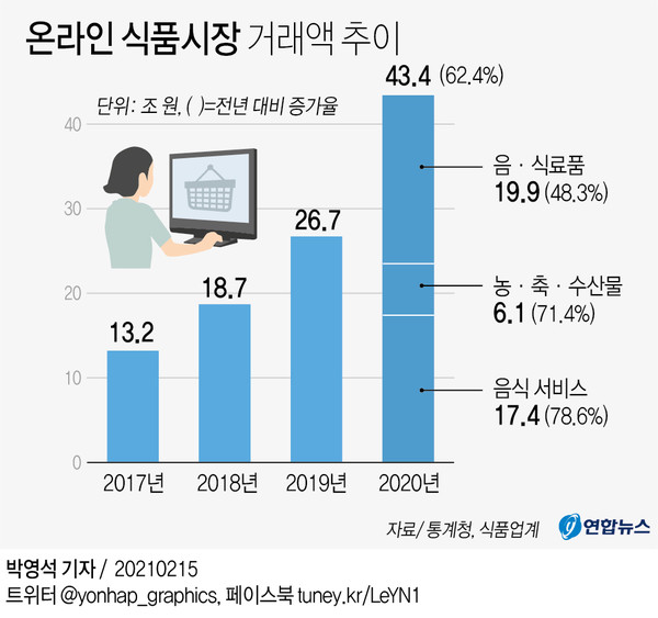 15일 통계청과 식품업계에 따르면 지난해 온라인 식품시장 거래액은 43조4000억 원으로 전년보다 62.4% 늘었다. 온라인 식품시장 거래액이 2019년 26조7000억 원으로 20조 원을 넘은 데 이어 2020년 단숨에 40조 원을 돌파한 것이다. 식품시장에도 비대면(언택트) 소비 경향이 뚜렷해졌기 때문으로 풀이된다.
