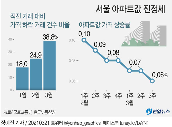 직전 거래보다 가격이 하락한 거래 건수는 1월 18%(전체 2441건 중 493건)에 머물렀으나 2월 24.9%(1669건 중 415건), 3월(1∼17일 기준) 38.8%(281건 중 109건)로 증가 추세다.