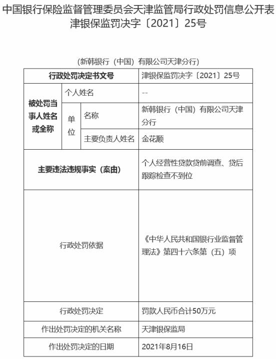 톈진은행보험관리국(이하 톈진은보국)은 지난 16일 신한은행 톈지분행(分行, 지역 거점 개념)에 개인 대출 관련 심사와 대출 후 관리 부실을 이유로 50만위안(약 9009만원)을 부과했다.