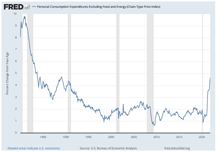-연준이 가장 선호하는 물가지표인 근원 개인소비지출(PCE) 물가지수 상승률은 지난해 11월 4.7%로 1989년 이후 최고치 기록. 연준은 근원 PCE 물가상승률이 올해 말 2.7%까지 떨어질 것으로 기대.