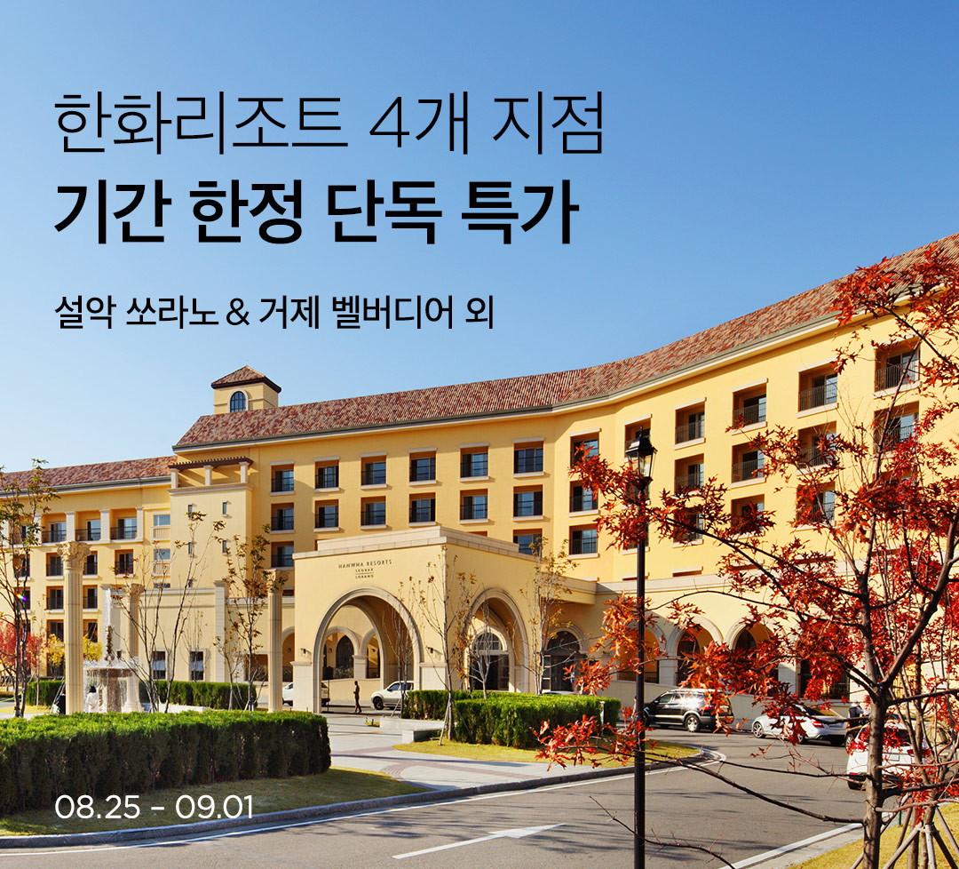 '한화리조트 단독 특가전'의 상품으로 실제 리조트 상품을 이용할 수 있는 기간은 9월 5일부터 10월 30일까지다. 상품별 기준인원은 4~5인이며 리조트 종류에 따라 최대 7인까지 숙박이 가능하다. 최대 78% 할인을 적용해, 1박 기준 13만 원 대부터 선보인다.