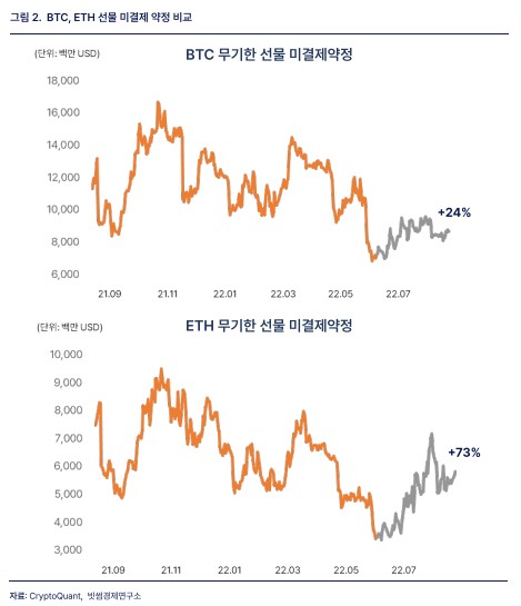 보고서에 따르면 국내 거래소의 경우 8월 중순 이후 이더리움 하루 거래금액이 비트코인을 대체로 상회했고, 해외 선물거래소에서 이더리움 선물 미결제약정은 9월 초 기준 6월 전저점 대비 73% 급증해 비트코인(24% 증가)을 넘어섰다.