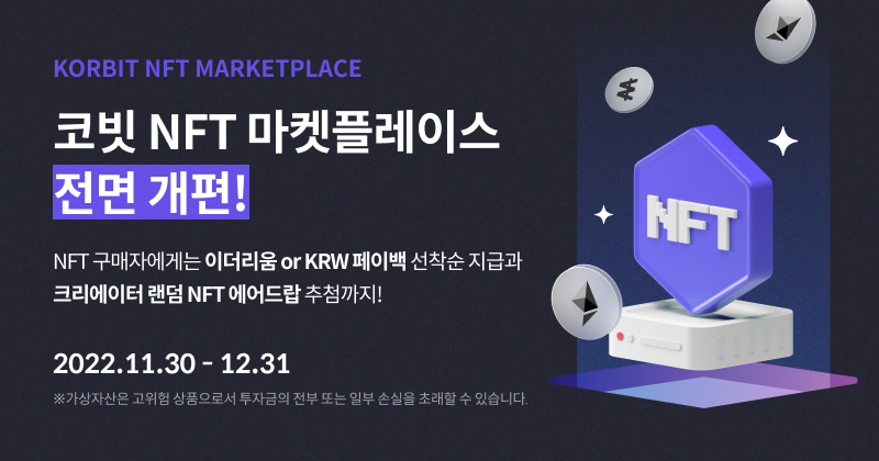 코빗은 NFT 구매 고객 대상 특별 사은 행사도 진행한다. 오는 30일부터 다음달 31일까지 열리는 이번 이벤트에서는 NFT 구매 고객 선착순 200명에게 NFT 구매 금액의 10%(1인당 최대 5만원 상당 현금 또는 이더리움)를 돌려 준다.