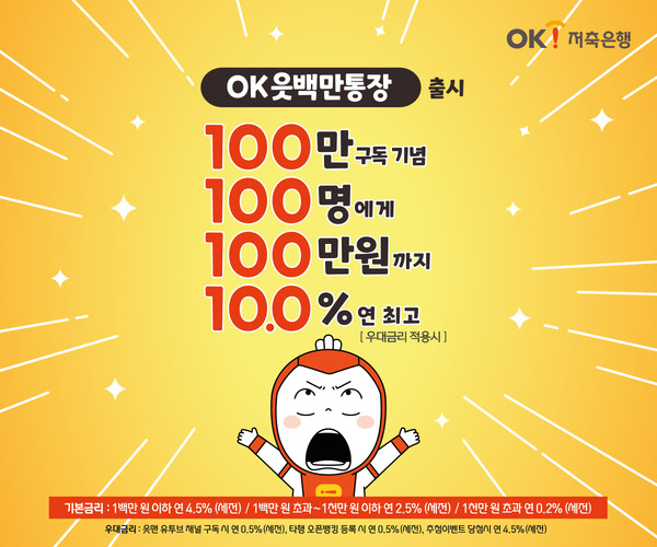 OK저축은행은 공식 유튜브 채널인 '읏맨'의 구독자수 100만명 돌파를 기념해 'OK읏백만통장' 특별 판매를 시작한다고 13일 밝혔다.