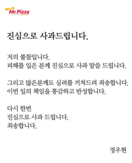 경비원을 폭행한 혐의로 경찰에 입건된 정우현 미스터피자 회장이 홈페이지에 사과문을 게재했다.