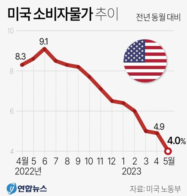 CPI는 지난해 6월 9.1%까지 올라 1981년 11월 이후 최고치를 경신했다. 그러나 올해 5월 4% 상승에 그치면서 2021년 3월 이후 가장 낮은 상승률을 기록했다.