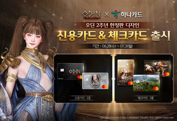 하나카드는 카카오게임즈와 손잡고 '오딘' 한정판 디자인을 담은 신용카드와 체크카드를 출시했다고 30일 밝혔다.