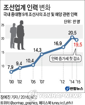 과거 국내 조선업계 인력은 호황에 힘입어 급증해 왔다. 2000년 7만9000여명에 불과했으나 2002년 9만4000여명, 2005년 10만4000여명, 2007년 14만3000여명, 2008년 15만1000여명, 2012년 16만9000여명, 2013년 18만3022명에 달했다. 그러나 지난해 최악의 적자를 내며 경영난에 몰리자 인력 증가세가 처음으로 꺾였다.