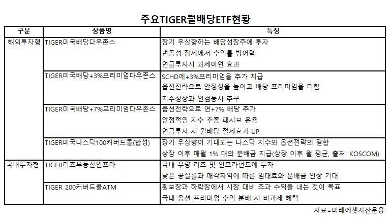 미래에셋의 대표적인 월배당 ETF는 미국배당 시리즈 3종을 꼽을 수 있다. 지난 6월 미래에셋은 배당으로 쏠리는 투자심리를 고려해 'TIGER(타이거) 미국배당다우존스 ETF(458730)'와 월배당에 프리미엄 수익 더한 'TIGER 미국배당+3%프리미엄다우존스', 'TIGER 미국배당+7%프리미엄다우존스' 등 3종을 출시했다.