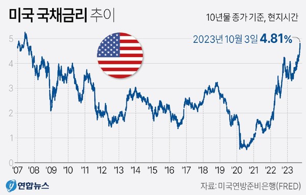 이는 전날 4.8%를 돌파한 뒤 4.884%까지 올라 2007년 이후 최고치에 이른 바 있다.