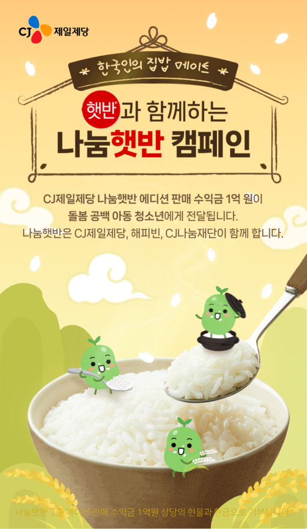 CJ제일제당은 네이버 해피빈과 돌봄공백 아동 지원을 위한 '나눔햇반 캠페인'을 진행한다고 15일 밝혔다.